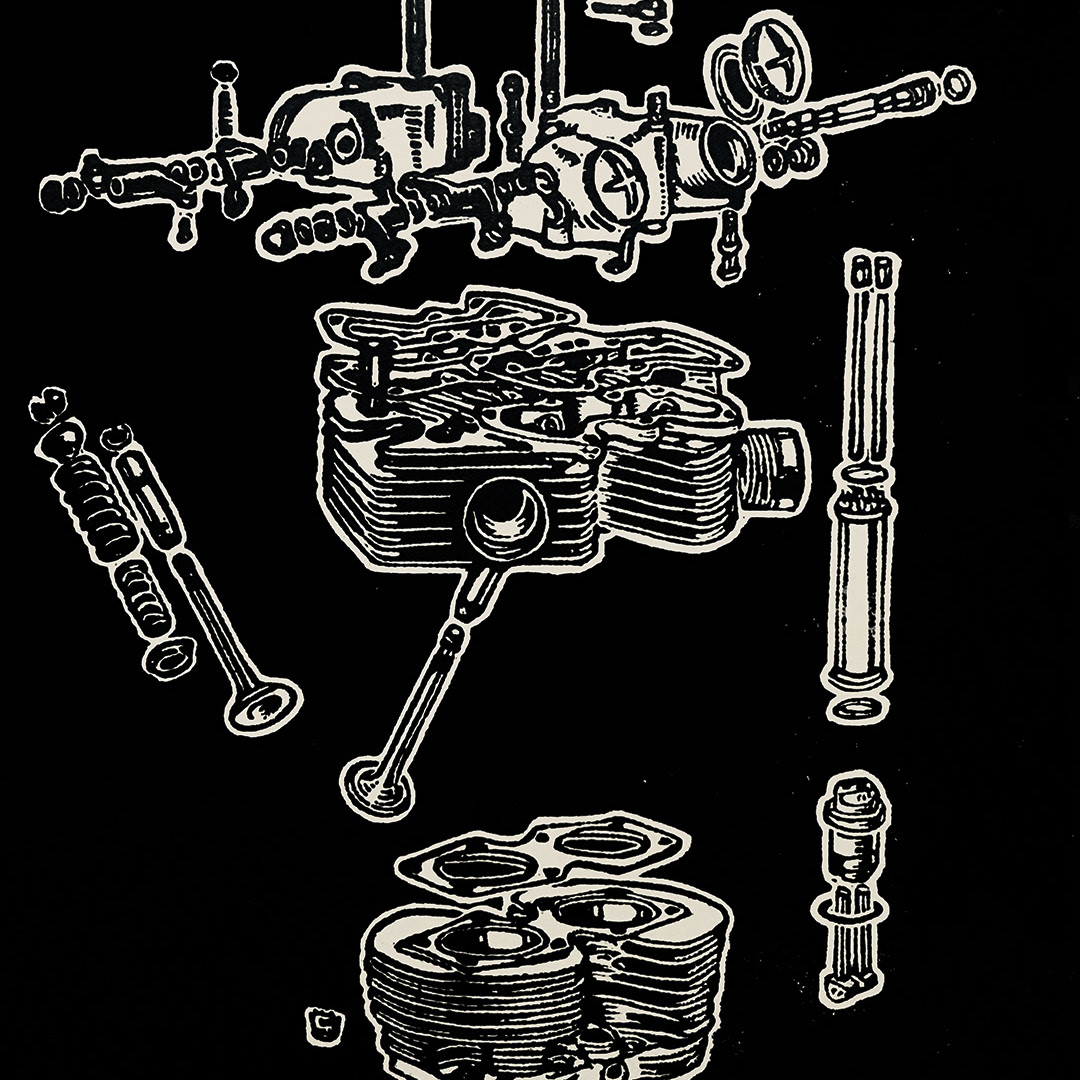 Clutch exploded view, Linoleum block print on Rives BFK. Oil-based ink