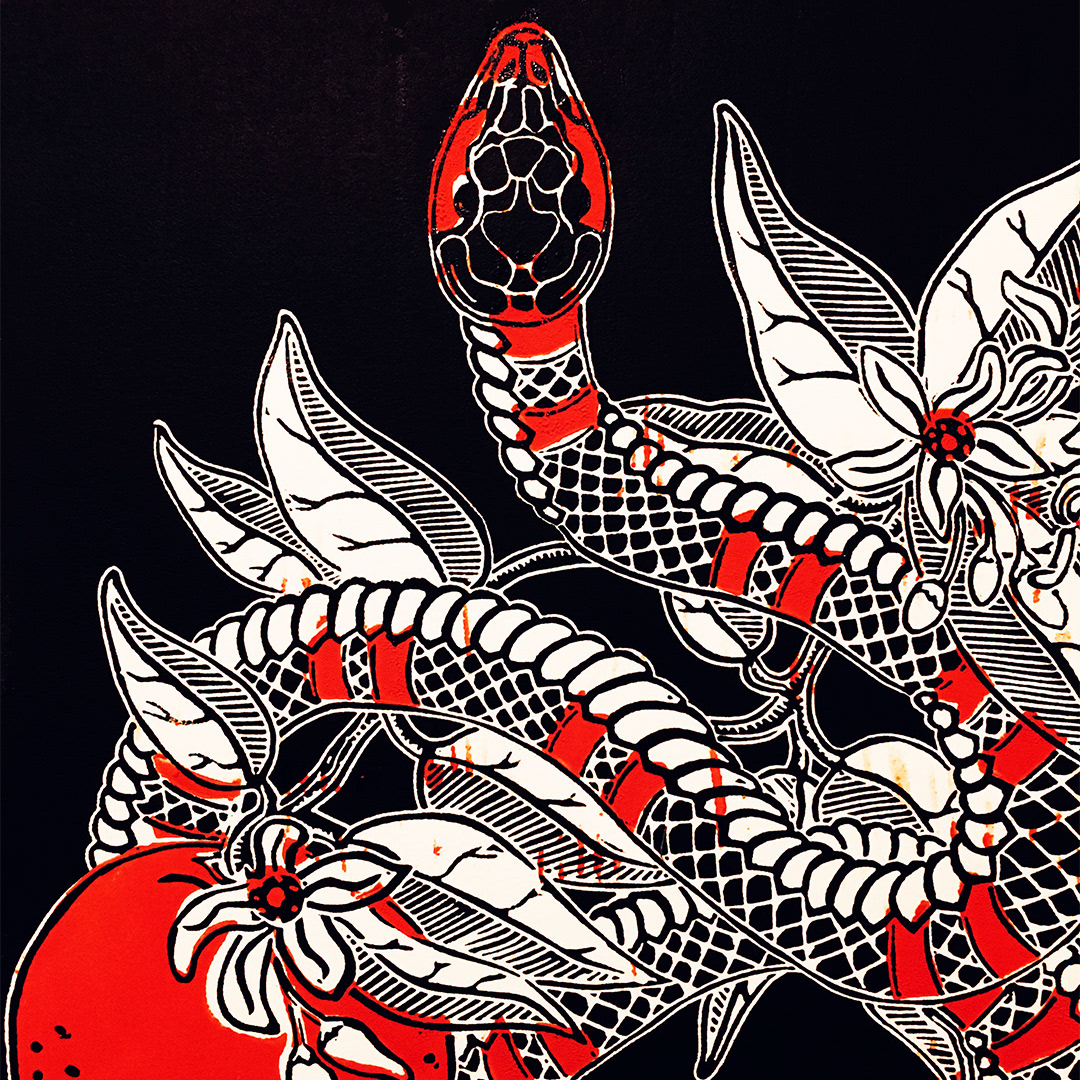 Linoleum block print printed on Rives BFK paper. Oil-based ink