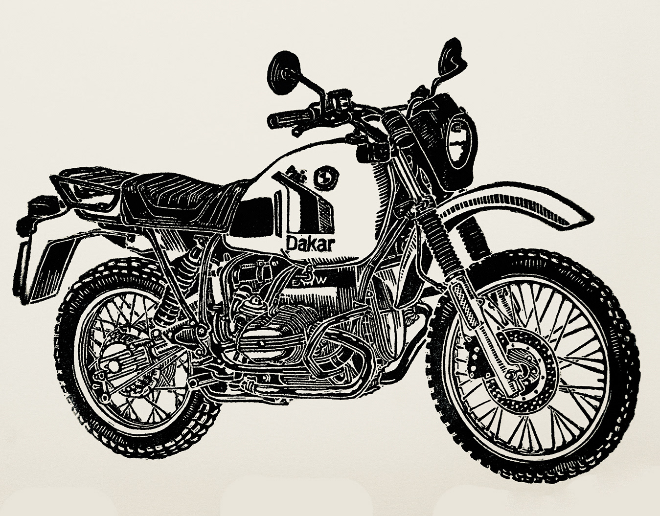 BMW R69s, Linoleum block print on Rives BFK. Oil-based ink