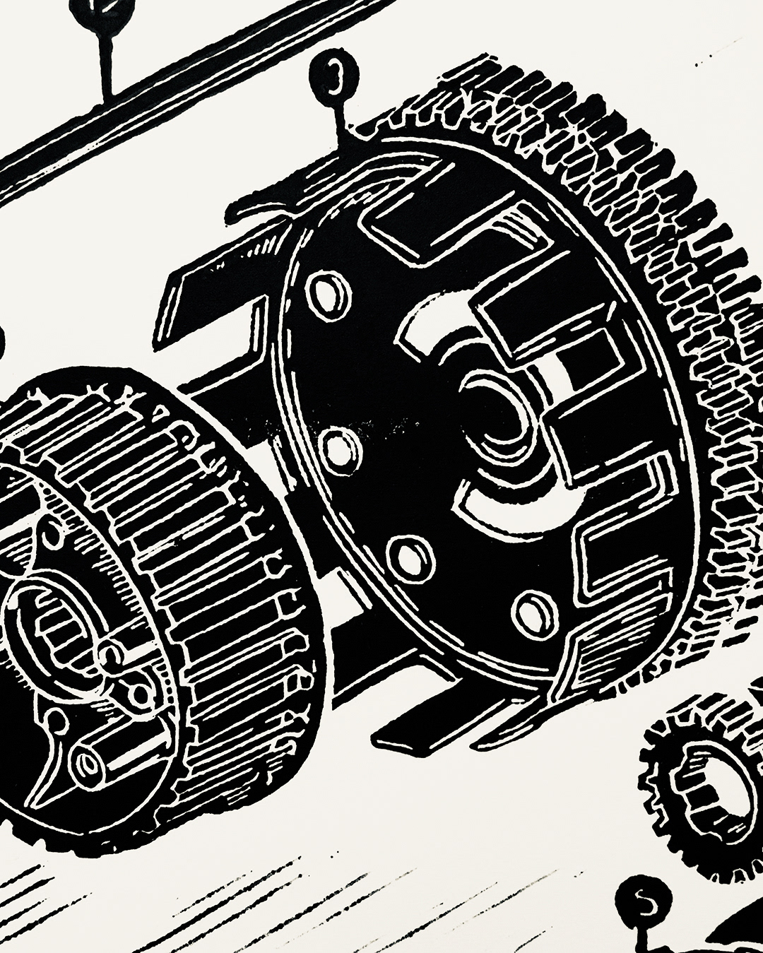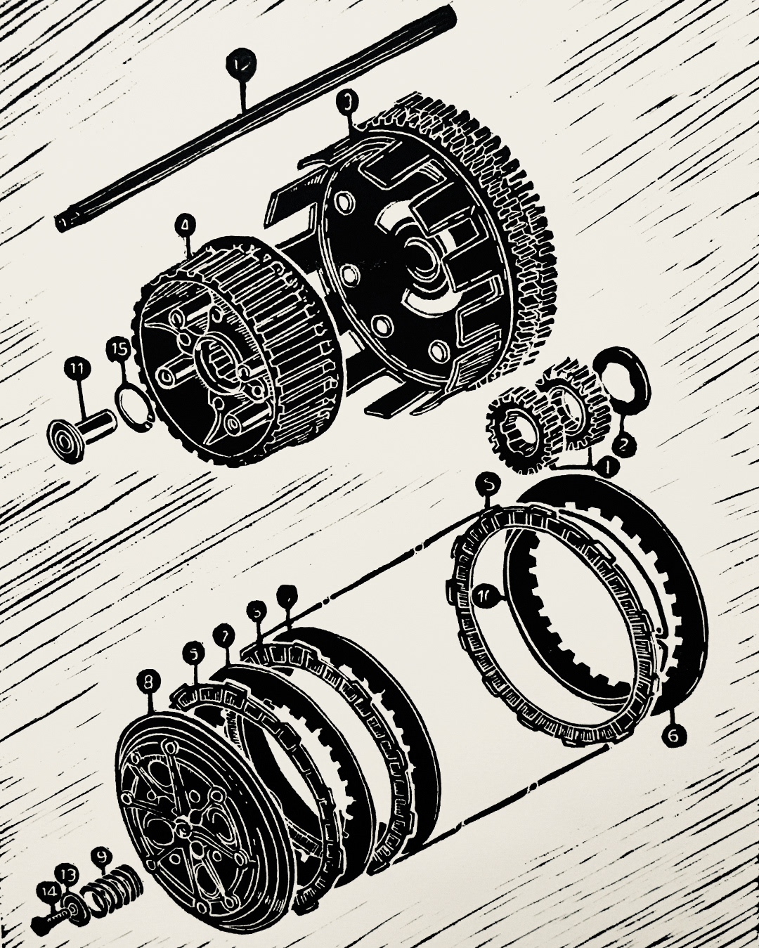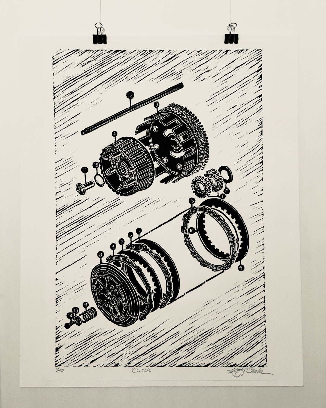 Clutch exploded view, Linoleum block print on Rives BFK. Oil-based ink
