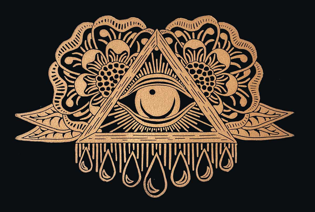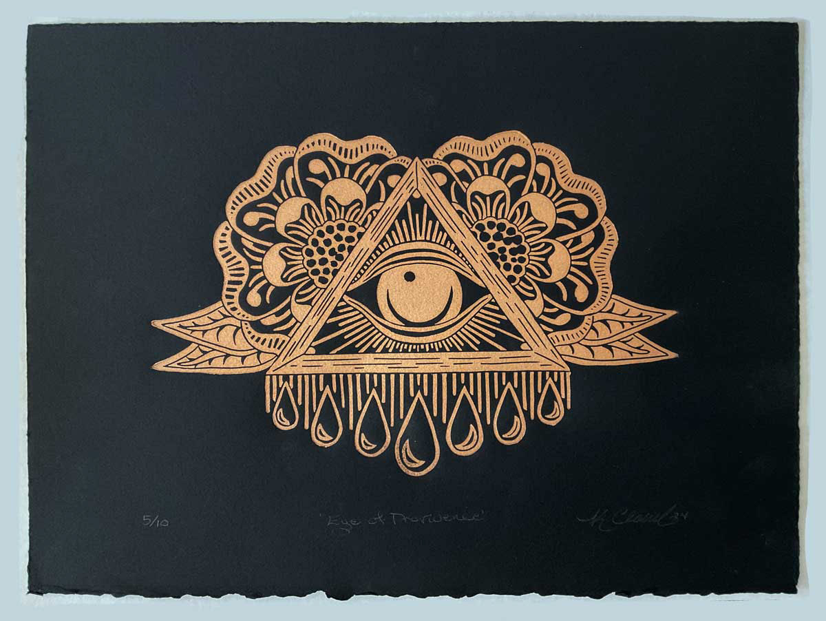 Linoleum block print 10" x 13" - oil-based copper ink on black Arches paper